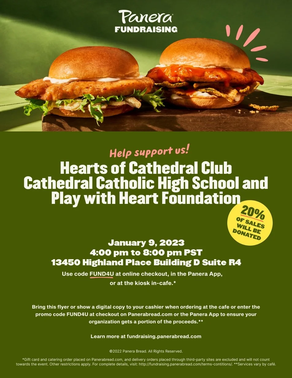 Join us on January 9th, 2023 from 4:00pm to 8:00pm PST at Panera Bread in Carmel Valley to help raise money for sudden cardiac arrest! The Play With Heart Foundation is partnering up with the Hearts of Cathedral Club from Cathedral Catholic High School to raise money for sudden cardiac arrest and awareness. Show this flyer to the cashier to participate!